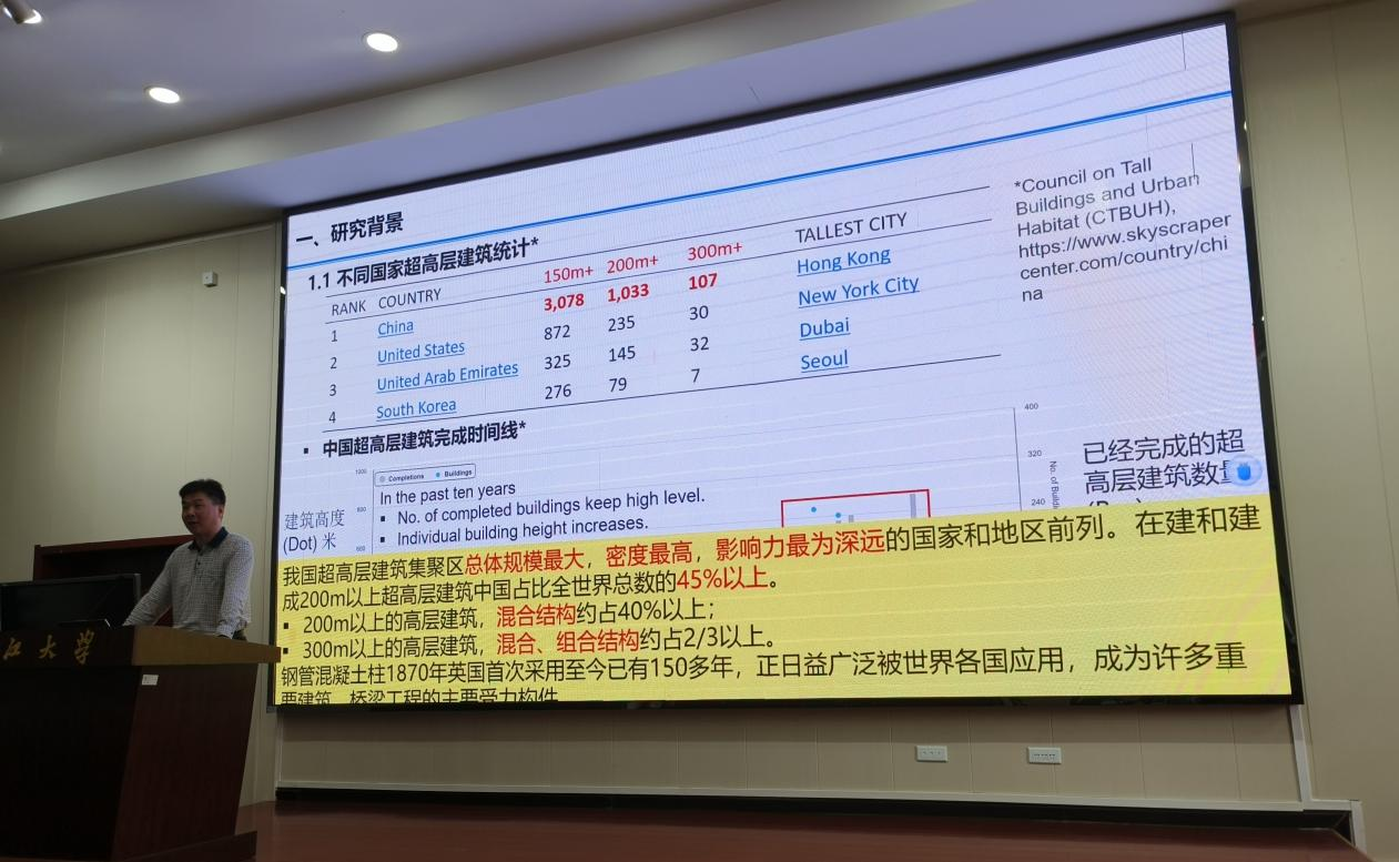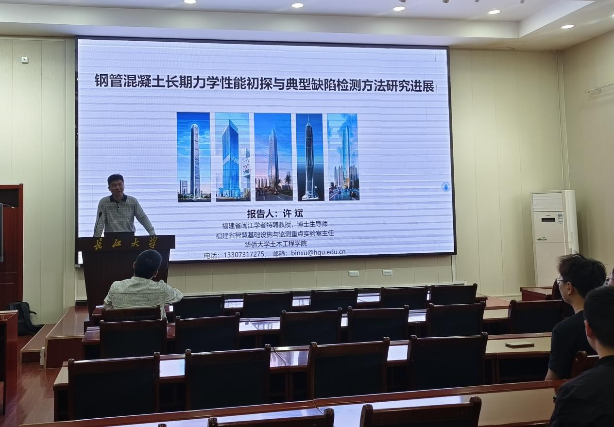 本次讲座主要围绕“钢管混凝土长期性能及构件力学行为”、“钢管混凝土典型缺陷检测技术、原理与典型工程应用”等方面展开。讲座伊始,许教授通过钢管混凝土的国内外发展历程及深圳赛格广场振动事件为切入点,提出了钢管混凝土长期性能应考虑核心混凝土长期变形、钢管混凝土构件力学行为应考虑实际传力方式等论点,并结合大量的科研试验数据,对钢管混凝土界面剥离等典型缺陷提出了基于压电材料的检测方法。