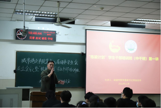 (通讯员 刘悦/文 张剑琳/摄)青春当奋斗,矢志作栋梁。11月21日上午10时许,城建公司第十八届团委学生会成立会议暨“栋梁计划”学生干部培训班第一讲活动在东校区12教102教室举行。院党委副书记周俊老师、院团委副书记何儒权老师,校学生会执行主席庄功伟,第十七届院学生会执行主席李英杰,以及第十八届团委及学生会全体成员,研究生会成员参加活动。活动由院团委组织部主要负责人董静怡主持。