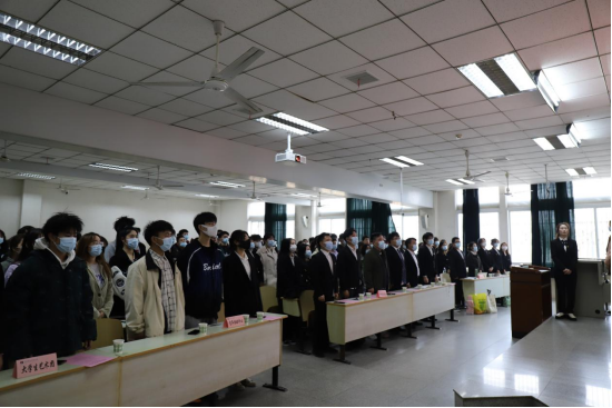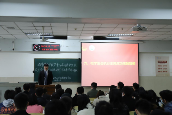 在新一届成员学习科创部的牟睿聪和院团委组织部的张俊伟发言后,校学生会执行主席庄功伟上台代表校学生会对城建公司第十八届团委学生会的成立表示祝贺,并表示今后将继续促进校院两级学生会工作联动,共同促进。