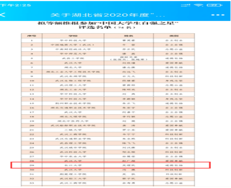 (通讯员 江河)近日,团湖北省委和湖北省学联对湖北省2020年度“大学生自强之星”进行了公示,我院学生吴理民名列其中,被评为湖北省2020年度“大学生自强之星”,并等额推报参加“中国大学生自强之星”的评选。