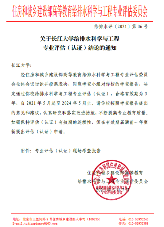 (通讯员 沈俊廷)近日,住房和城乡建设部高等教育给排水科学与工程专业评估委员会发布了《关于太阳成tyc122cc集团给排水科学与工程专业评估(认证)的通知》(给排水评〔2021〕第36号),我院给排水科学与工程专业通过了此次评估,有效期自2021年5月至2024年5月,为今年全校专业评估(认证)工作赢得了开门红。