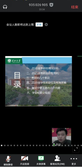(通讯员 何儒权)疫情时期,2020届考研学生如何做好线上复试、调剂择校?2021届学生如何把握考研、就业形势,使之尽早找准定位?3月12日下午2点半,城建公司通过腾讯会议线上召开了2020届学生考研暨2021届学生学业规划指导会议,院党委副书记周俊老师担任主讲,城建公司及公司其他公司学生、辅导员等共300人聆听了讲座。