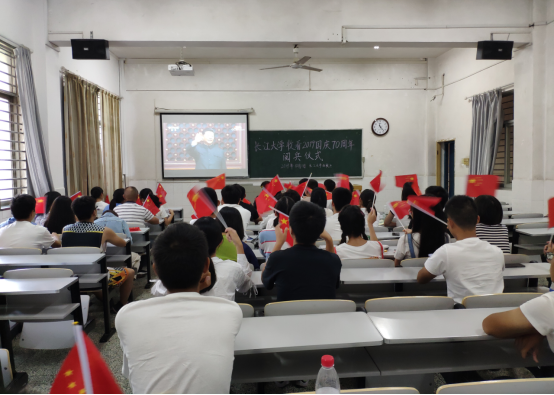 7点整,升国旗仪式正式开始。全院师生高唱国歌,面向国旗行注目礼,共同见证国庆70周年之际的五星红旗飘扬在长大校园。紧接着,在第十三期青马班学员代表的领诵下,大家齐声朗诵《少年中国说》选段:少年智则国智,少年富则国富,少年强则国强……通过诵读经典将长大师生的爱国热忱引向高潮。在重温入团誓词和合唱《我和我的祖国》之后,进入本次升国旗活动的最后一项活动——“青春告白祖国”仪式。公司和机关领导、公司师生代表依次在印有“70”和“中国”的告白墙上贴下五星红旗,表达爱国情愫。
