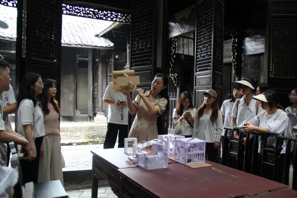 结合专业特色,支部在瞿家湾明清古街开展现场教学。建筑系王老师围绕当地“青砖黛瓦、飞檐翘角”的徽派与江汉民居融合风格,深入解析了江汉平原传统民居的构造智慧与空间美学。随后,学生党员以“瞿家湾传统民居改造设计”为题,进行现场草图绘制与简易模型制作,王老师悉心给予专业点评。