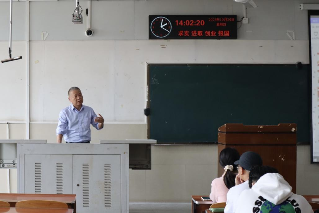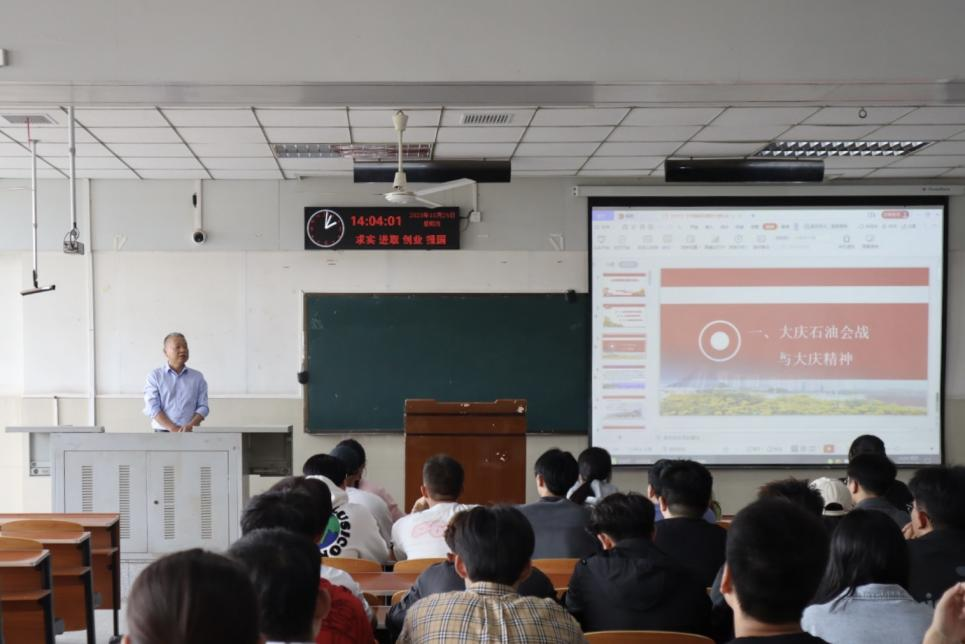 接着,叶院长向同学们讲解了“爱国、创业、奉献、合作”的大庆精神基本内涵。一是为国争光、为民族争气的爱国主义精神;二是独立自主、自力更生的艰苦创业精神;三是讲求科学、“三老四严”的科学求实精神;四是胸怀全局、为国分忧的奉献精神。