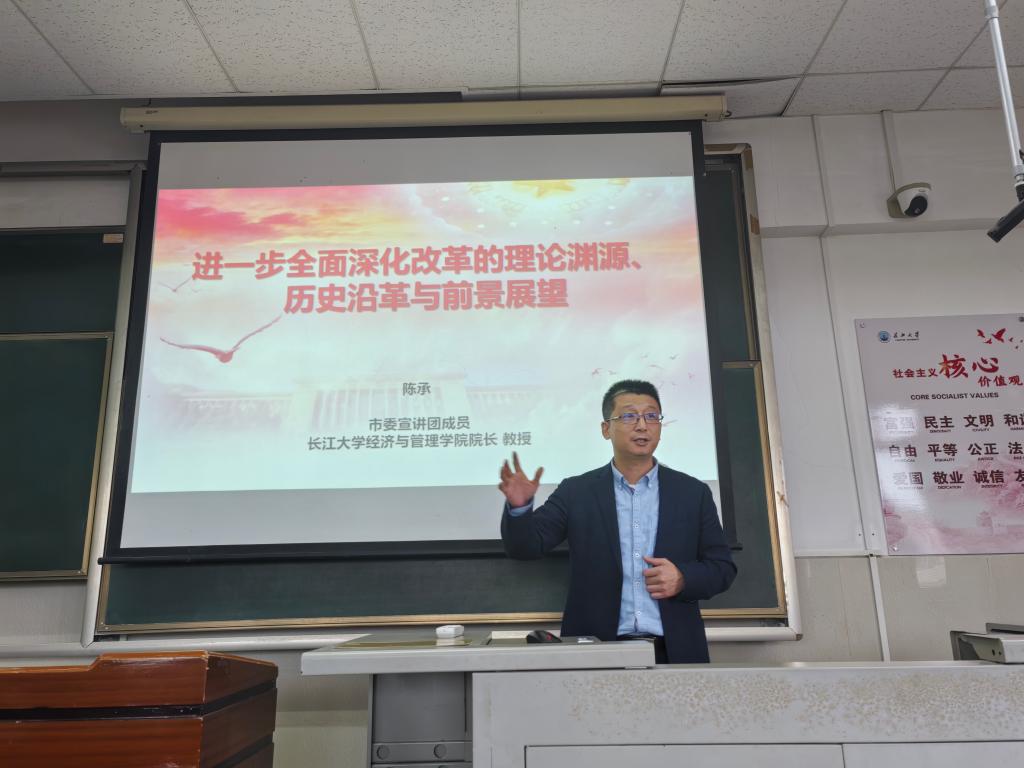 学习贯彻党的二十届三中全会精神宣讲团成员、经济与管理公司院长陈承教授作题为《进一步全面深化改革的理论渊源、历史沿革与前景展望》的讲座。