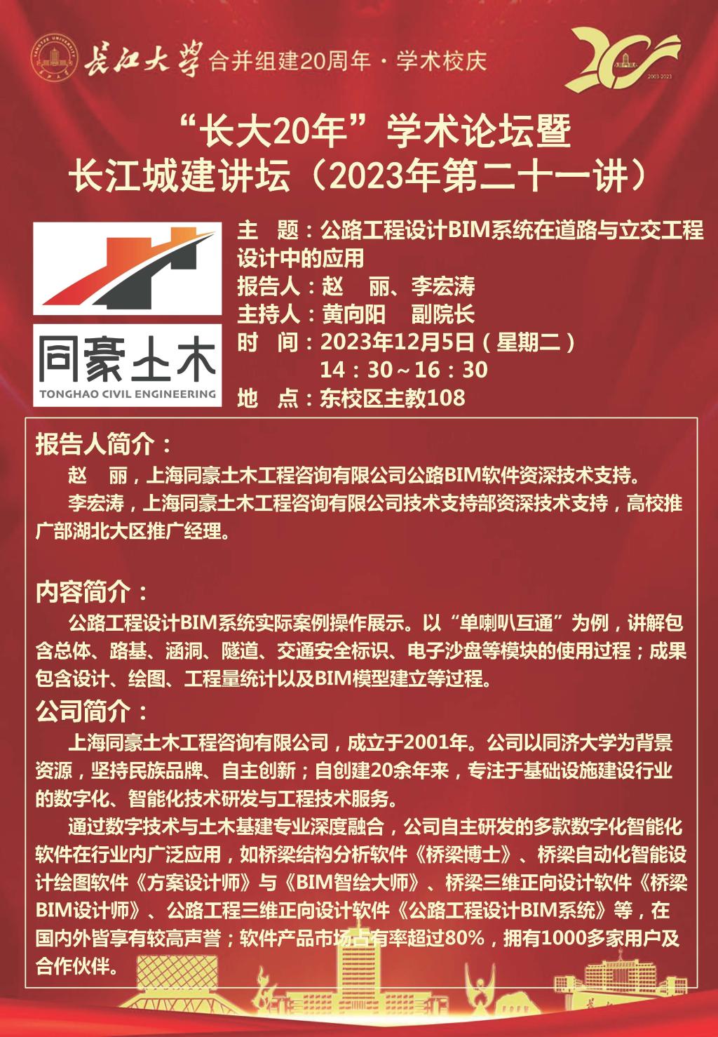 “长大20年”学术论坛暨长江城建讲坛(2023年第二十一讲):公路工程设计BIM系统在道路与立交工程设计中的应用