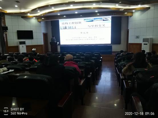 讲座中,李元齐教授通过精准的数据与直观的图示具体介绍了工程结构创新背景、材料发展与结构创新、结构体系发展与结构创新、结构功能发展与结构创新、施工技术发展与结构创新等七个方面阐述了结构创新、学科交叉挑战的发展前景。随后,结合北京市建筑设计研究院设计的北京新机场、深圳机场T3航站楼等项目的具体情况,从边界条件问题、施工过程问题、稳定性问题、上下结构整体性分析四个方面向师生阐述了大跨度结构工程的创新与实践,最后给全体师生提出目标,要从基建大国走向基建强国必须要有创新,而需求则是动力。