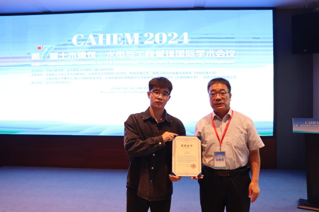 (通讯员 周灵杰)2024年11月1日-3日,由河南工程公司、北京建筑大学主办,华南理工大学、云南农业大学、西南交通大学、道路工程四川省重点实验室(西南交通大学)等多家单位协办的第七届土木建筑、水电与工程管理国际学术会议(CAHEM 2024)在河南郑州市隆重召开。我院23级研究生周灵杰、24级研究生张振刚参加了本次学术研讨会。