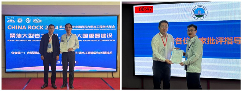 本次年会以“聚焦大型岩土工程,服务大国重器建设”为主题,邀请了国内外多名院士和业内专家开展主题报告。我校是本届学术年会的协办单位之一,肖桃李院长被邀请作为分会场一特邀报告的主持人。赵云峰副教授在大型岩土工程分会场作题为《基于声发射的材料破坏雪崩特征研究》的主题报告,路世伟副教授在大型通航工程建设分会场作题为《地下双圆形隧洞的动力响应特征理论研究》的主题报告,他们还就与会者的各种提问进行了深入探讨与交流。外国留学生苏晨博士在博士及留学生论坛作题为《基于蜂群优化算法和深层特征选择的路面裂缝自动识别研究》的主题报告。研究生程导分享了“SH波不同波形下对空穴的动力响应特性研究”,李顺分享了“导电水泥基复合材料的机敏性能研究”,司余洁分享了“含共面双裂隙岩体力学特性及断裂特性分析”,胡量分享了“雁型双裂隙砂岩力学特性及裂纹演化规律研究”,刘思其分享了“页岩水化扰动损伤试验研究”,陈泽曦分享了“花岗岩残积土水理化效应对隧洞压力拱的影响”,梁延续分享了“岩石冲击损伤演化特性及加荷统计损伤本构模型”。
