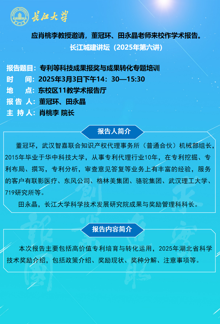 长江城建讲坛2025年第六讲:专利等科技成果报奖与成果转化专题培训