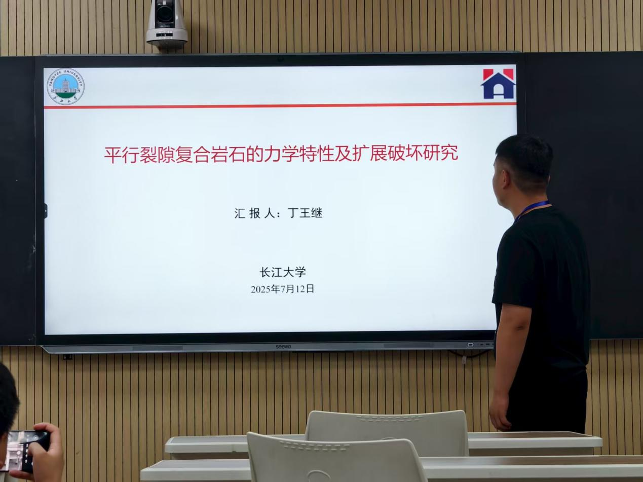 我院2024级研究生丁王继在论坛中以“平行裂隙复合岩石的力学特性及扩展破坏研究”为题进行汇报,汇报主要内容是探究裂隙复合岩体力学特性及破坏机制,采用相似材料制备含不同位置与倾角平行裂隙的砂岩-灰岩复合岩样,开展单轴压缩试验,结合数字图像相关(DIC)与声发射技术,研究裂隙分布对力学特性、裂纹扩展及损伤演化的作用机制。