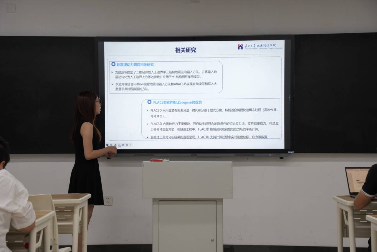 我院2023级研究生孙睿哲在论坛中以“SV波和P波作用下隧道动力响应特征研究”为主题进行了汇报,内容主要聚焦于结合 FLAC3D 与 MATLAB 软件,研究地震波斜入射下隧道动应力响应的分析方法。通过理论软件结合揭示不同地震动参数下SV波和P波的传播规律及其对地下隧道的动力响应机制,旨在准确评估地震荷载对隧道结构的损伤效应,同时为提升城市地下空间抗震能力提供理论支撑与技术参考。