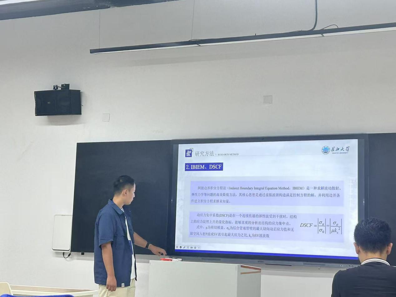 我院2023级研究生易舜在论坛中以“SH波作用下城门洞形隧道动力响应分析”为主题进行了汇报,内容主要以全空间中的深埋城门洞形隧道为研究对象,以间接边界积分方程法(IBIEM)和弹性波动理论为基础,对在平面SH波作用下的城门洞形隧道的动力响应问题展开研究,旨在更好地理解隧道在受到外部动态荷载时的响应特性。这不仅有助于优化隧道设计,提高其抗震能力,还能为隧道的日常维护和灾害预警提供科学依据。