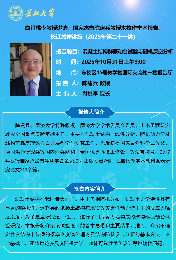 长江城建讲坛2025年第二十一讲:混凝土结构群振动台试验与随机反应分析