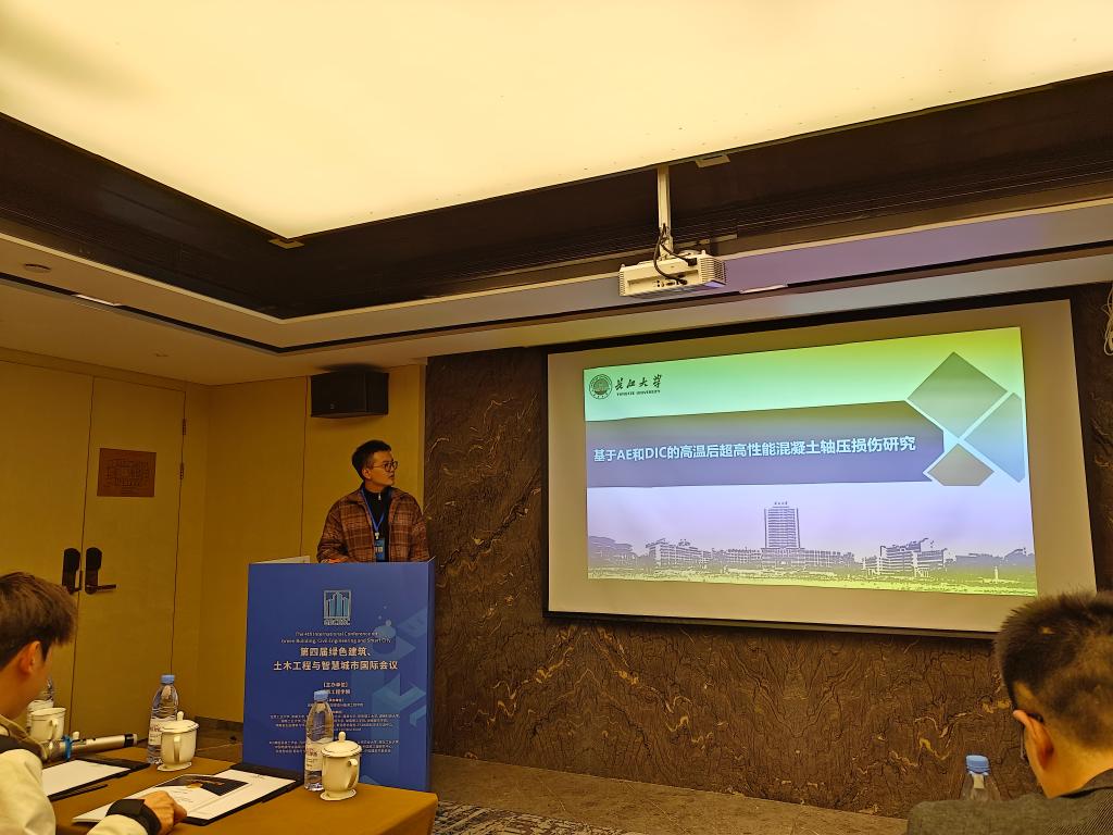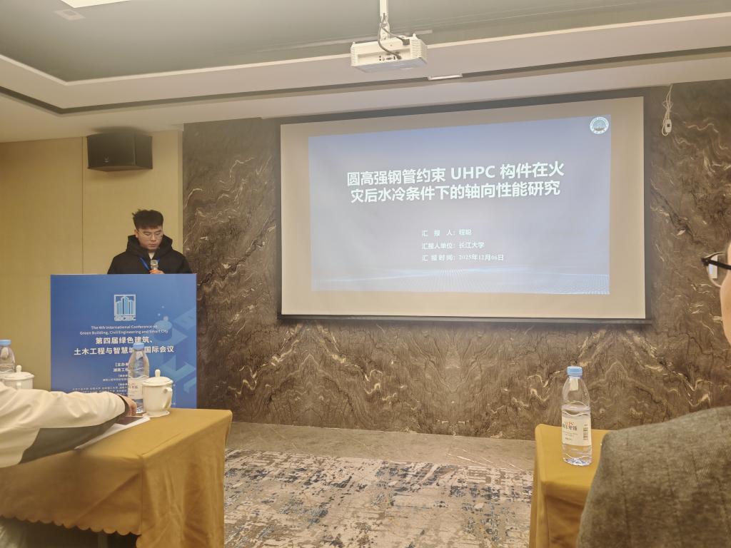 2024级研究生程聪在会议中作汇报“Research on the Axial Performance of UHPC Components Constrained by Round High-Strength Steel Tubes under Water-cooled conditions after Fire”,内容主要通过修正现有的圆钢管约束混凝土本构模型,建立具有良好模拟精度的火灾后水冷作用下圆高强钢管-UHPC本构模型。基于极限分析法,提出火灾后水冷作用下高强圆钢管超高性能混凝土结构柱的承载力计算方法,为火灾消防喷水后相关构件的承载能力评估与工程安全保障提供了科学参考。