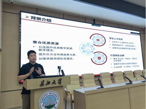袁洪强老师向22级国土学生详细介绍了组建留学考研班(简称“国研班”)的实施方案、培养规划和选拔条件。他强调组建留学考研班是公司对中外合作办学项目的资源整合,是公司打造特色育人项目的有效途径,希望同学们能把握住机会,通过在国研班学习提升自己的综合素质能力。