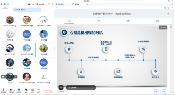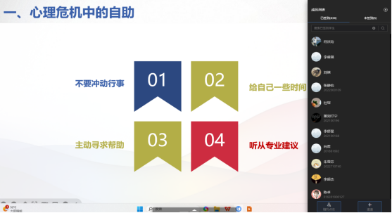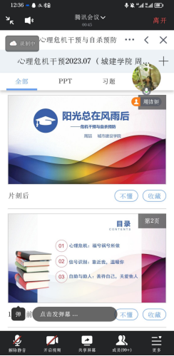 (通讯员 江子航)2023年7月6日中午12:30,公司在雨课堂和腾讯会议开展以“心理危机干预与自杀预防”为主题的心理骨干培训会议,参加会议的有公司研究生代表和19级-22级学生干部。公司学工办主任周洁如老师担任主讲。