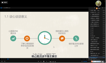 会上,老师们首先观看了《心理测评量表讲解》视频内容,认识到了学生心理普查的重要意义,并且了解到如何运用量表数据信息对测试学生的心理素质进行评定。随后,大家又学习了《谈心谈话培训》视频内容,该视频从谈话意义、谈话技巧和访谈技术三个方面,针对班主任谈心谈话的原则和方法进行了深入浅出的介绍,让大家对谈心谈话的相关理论知识有了系统的认识与了解。