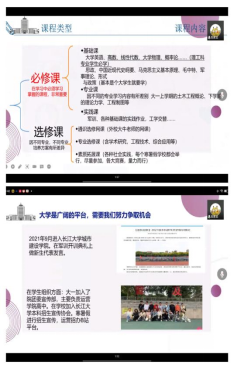 之后,会议进入第二阶段,由三位高年级学长学姐分享了自己求学期间的感悟体会。土木类张琳学姐提到“大学会遇到很多新鲜事物,切不可被外物扰乱了心扉”;国土班郑建龙学长细致地向新生介绍了公司学生组织架构,并提出了平衡学习和生活的宝贵建议;最后城规11901班董静怡学姐分享了自己大学三年的收获与经验,她鼓励新生“学业有目标、生活有乐趣、专业有发展、未来有期待”。学长学姐的分享,为初入校园的新生提供了宝贵的经验,指明了正确的方向。