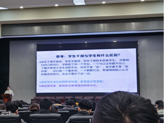 培训的第四节课上,机械公司的向如老师以《学生干部应具备的能力和素养》为题,就学生干部应具备的能力和素养两个方面进行了一系列讲述,明确了学生干部应具备的四大素质和四大意识。同时引用习近平“正人先正己”的观点,为学生干部提高自我的重要性。