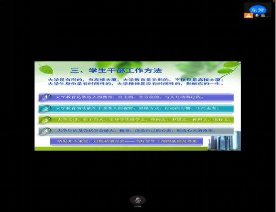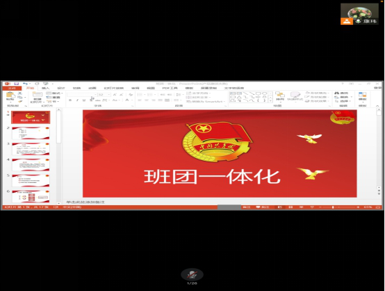 此后,电子信息工程公司康玮老师通过腾讯会议的方式为同学们讲解班团一体化建设理论与实践。康老师主要为大家介绍了班团一体化的基本概念,强调了班团一体化的重要性,展示了班级和团支部建设运行中的主要现状和问题,明确了新形势下的班团一体建设的实施途径。同时,康老师提出了班团关系的新界定,班团目标的一体化设计,班团运行的一体化推进,班团干部的一体化设置和班团管理的一体化统筹。康老师的讲解为我院班团一体化的实践明确了方向,奠定了理论基础。