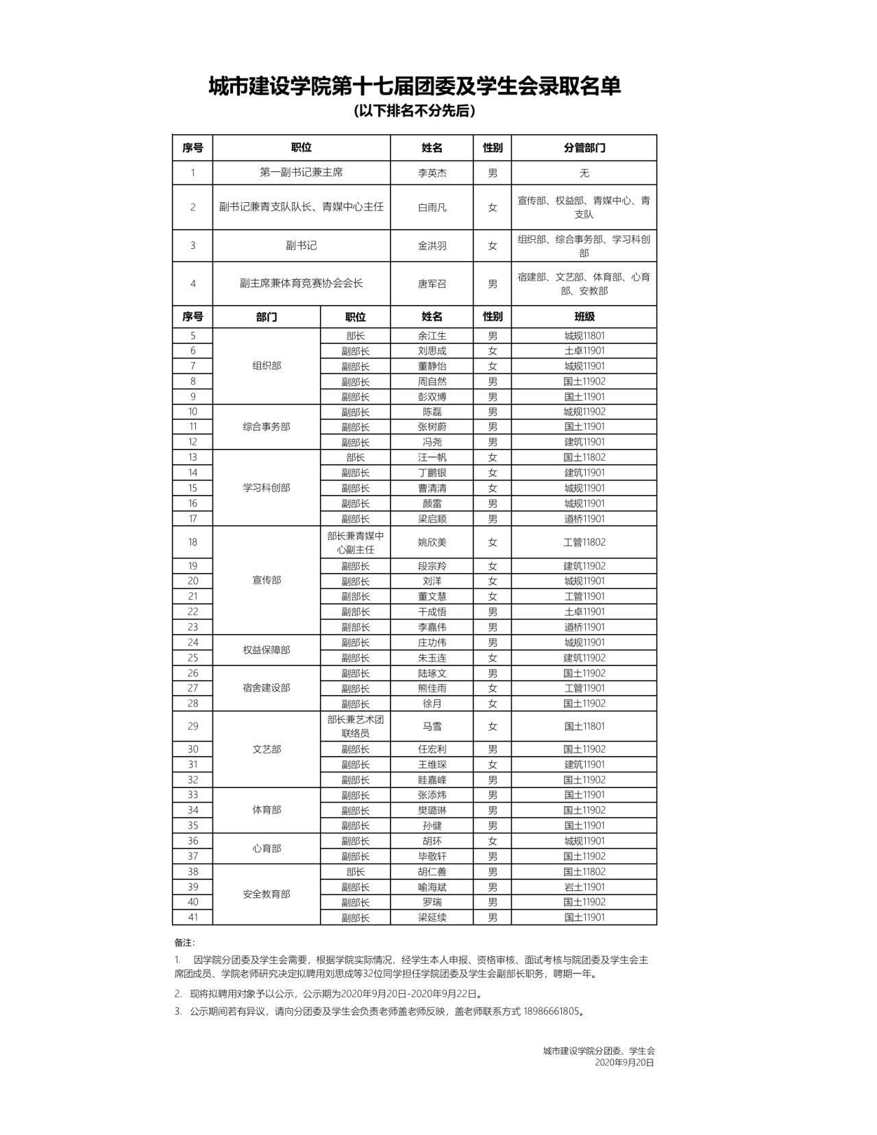 各位城建师生,大家上午好: 经学生本人申报、资格审查、面试考核与院团委学生会各部门部长、主席团成员、公司老师研究决定,太阳成tyc122cc集团第十七届团委及学生会(东区)招新结果已出,详情公示如下: