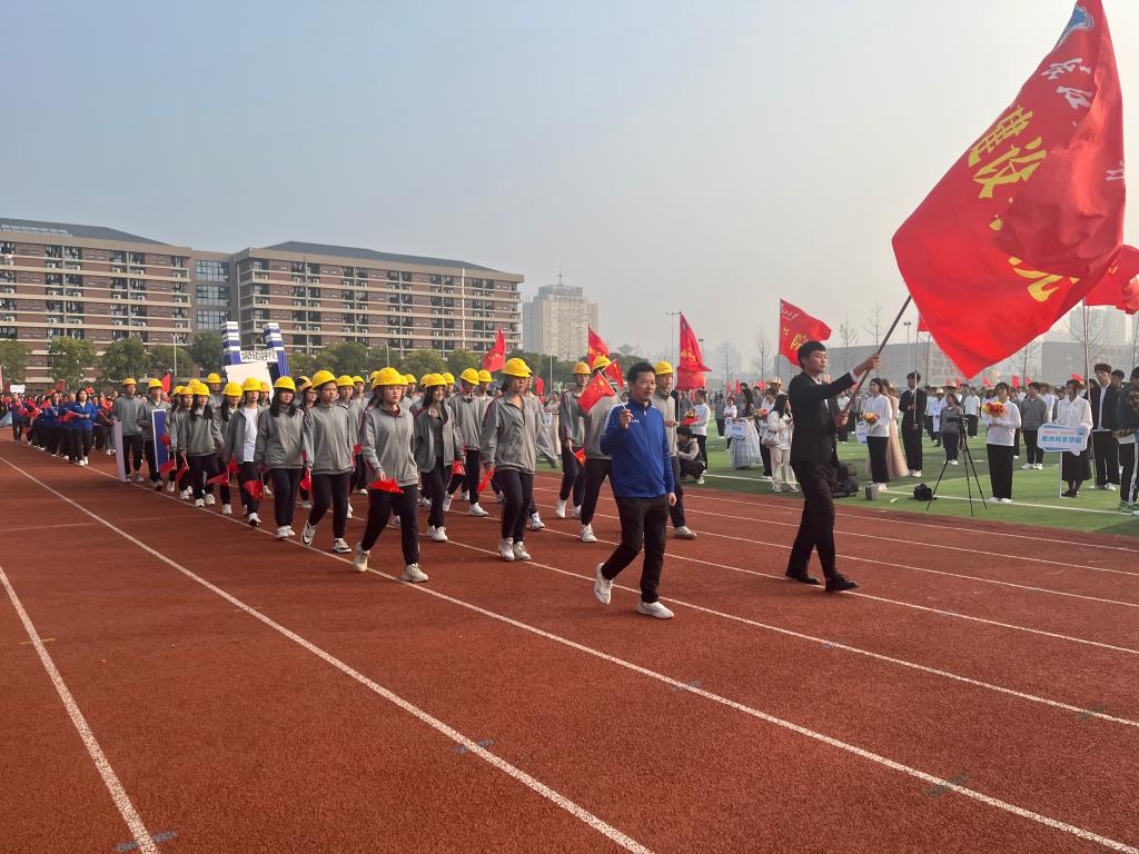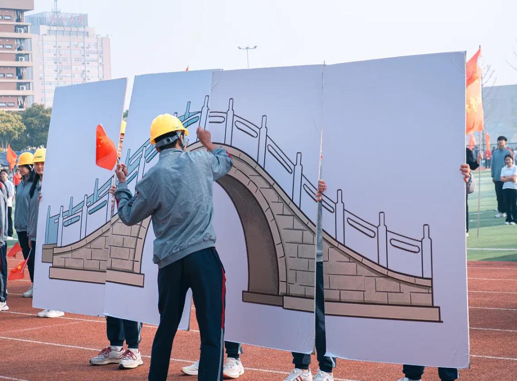 在运动会开幕式上,我院同学身着统一服装,佩戴着象征公司特色的黄色安全帽。整个方阵步伐整齐,气势浩荡。“城市之光,城建启航,运动赛场,激情飞扬”,铿锵有力的口号,更是响亮地回荡在操场上。这简短的语句不仅生动描绘了城建学子昂扬向上、奋勇拼搏的精神风貌,而且展现出了城建学子实践实干的独特风采。