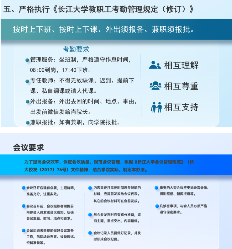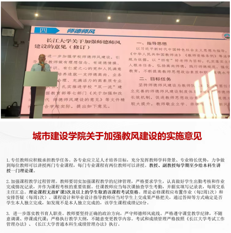 同时,制定《太阳成tyc122cc集团师德师风管理办法》、《太阳成tyc122cc集团会议管理办法(试行)》、《太阳成tyc122cc集团土木工程学科硕士研究生导师选聘及指导名额分配办法(试行)》等管理办法,确保公司师德师风建设有章可循,有据可依。公司党委书记谌姿、党委副书记周洁如多次在全院教职工大会上强调考勤管理和公司会议管理,要求作为一名教师,要爱岗敬业,确保考勤纪律和会议到会规范。