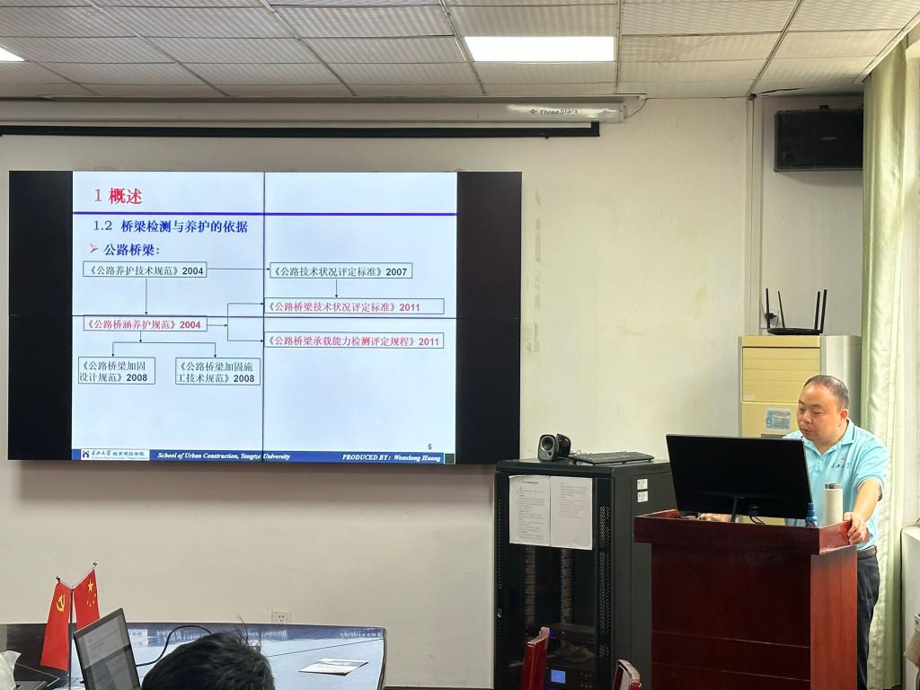 硕士生导师黄文雄副教授的报告题目是“基于桥梁定期检测的荆州城区桥梁健康状况综合评价”。本报告以荆州城区近10年桥梁定期检测资料为基础,对荆州城区桥梁健康状况进行综合评价;选取部分典型桥梁,依据检测数据,对相应桥梁健康状况进行针对性分析与评价。