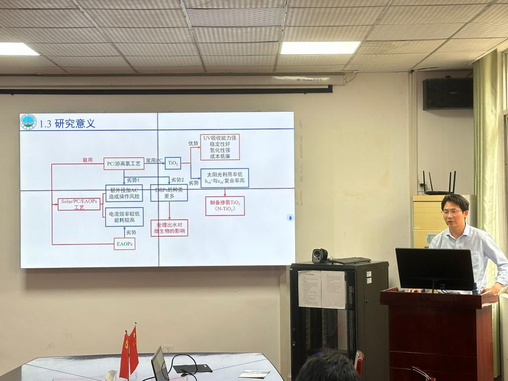 硕士生导师吴小刚副教授作题为“原位电产次氯酸/太阳光催化协同处理污水:PPCPs降解、消毒与副产物调控”的报告分享。报告主要为解决偏远地区水处理中消毒剂运输的安全风险问题,研发了一种新型Solar/PC/EAOPs水处理体系。该体系巧妙利用废水中天然存在的氯离子,通过电化学原位生成次氯酸,并结合太阳能光催化进行高效处理。此方法实现了氯资源的循环利用,无需外部运输次氯酸,显著提升了操作安全性。体系设计基于双循环产生活性氧化物种的原理,电化学与光催化的耦合展现出明确的协同效应,为偏远乡镇水厂提供了一种可靠、低风险的深度处理与消毒解决方案。硕士生导师郝勇副教授作题为“工程常用研究方法综述”的学术报告。报告介绍了常用工程研究方法,理论分析的基本原理,模型的比例关系及参数选择,各种非线性方法的原理及应用。它主要用于指导研究生进行科研设计及论文撰写,包括理论分析,模型实验,数值模拟及人工智能拓展应用等方面。