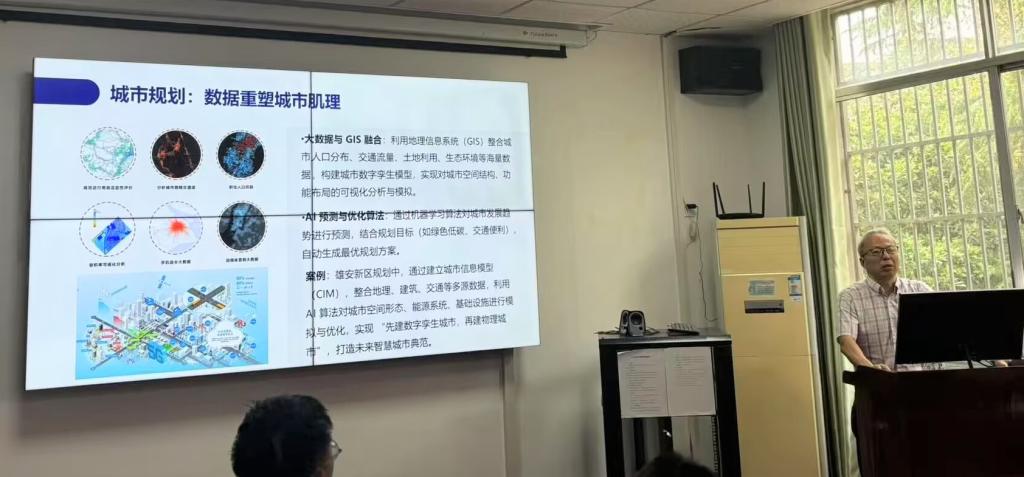 随后,硕士生导师刘显成教授带来了题为“人工智能与智慧建筑”的精彩分享。本次讲座聚焦智慧建筑领域,解读了智慧建筑定义与核心架构,介绍了人工智能作为技术底座的支撑作用,探讨技术驱动全流程智能化革新,呈现多样场景实践,分析了人工智能下智慧建筑发展中的机遇与挑战。