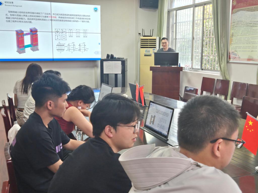 硕士生导师张衡副教授作题为“型钢混凝土推出试件参数全局灵敏度研究”的报告分享。组合构件的极限承载力受型钢与混凝土界面粘结性能的直接影响,混凝土作为一种多相复合材料,其力学特性存在固有的不确定性,导致型钢混凝土构件的承载力呈现一定的离散性。本报告从概率角度对型钢和混凝土界面的粘结滑移性能开展研究,建立了型钢混凝土粘结滑移随机本构模型,探究本构参数对试件极限承载力的影响规律,研究结果为组合结构构件的设计提供参考。