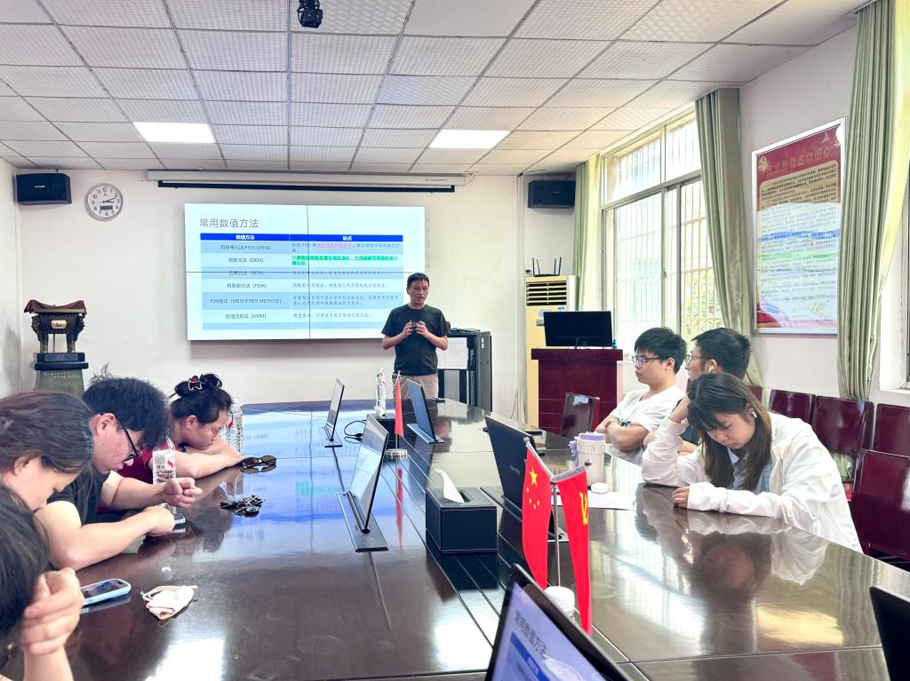 硕士生导师彭从文副教授带来了题为“基于渐近展开法的双尺度计算方法研究”的精彩分享。本报告主要针对岩石、混凝土等准脆性材料的破坏过程。采用渐进展开法得到宏细观尺度上二套边值方程,宏观尺度材料参数由细观尺度模型计算得到。计算方法考虑材料细观尺度上的非均质性,宏观裂纹出现后采用基于应力-位移本构关系,能在一定要程度上克服裂缝网格依赖性。数值计算通过ABAQUS二次开发内嵌子程序实现。